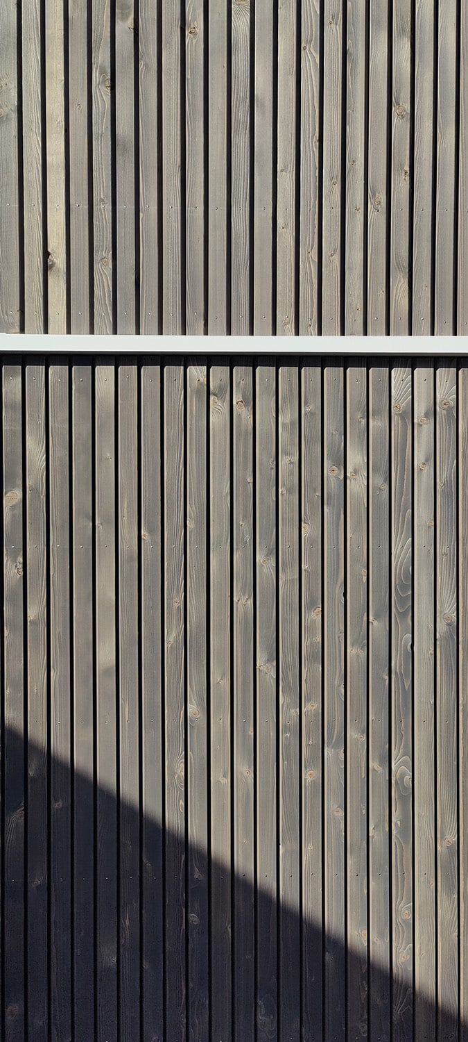 Le traitement de cette façade unique conjugue tradition locale et modernité. Elle utilise un bardage bois, matériau typique de la région, mais s’en distingue par un traitement contemporain. Le bardage, posé de manière oblique, est rythmé par une variation de sens entre les parties haute et basse. Ce jeu d’angle crée un dynamisme visuel et une perception changeante de la surface : sous l’effet des ombres et des lumières, la façade semble animée d’un mouvement subtil et continu. Pour affirmer cette modernité et articuler la composition, un liseret en aluminium blanc a été inséré horizontalement. Au-delà de sa fonction esthétique — animer et cadrer la façade — il sert de cimaise technique au bardage, soulignant la transition entre les deux orientations du bois. La nouvelle dépendance s’insère ainsi comme un volume discret, élancé et qualitatif qui, par sa position et son design, répond pleinement à l’objectif de libérer le cœur du jardin tout en l’enrichissant.